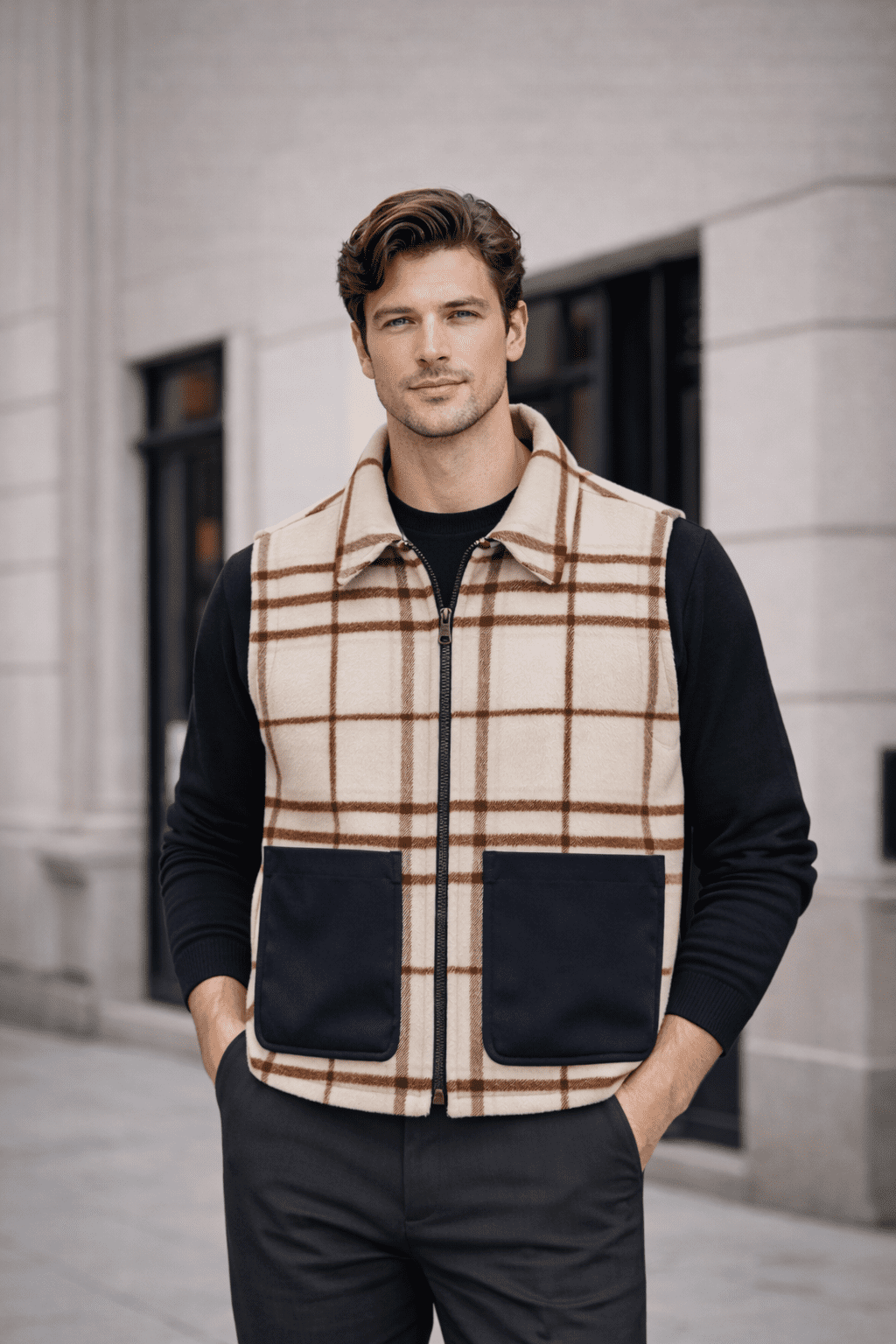A refined wool gilet designed for layered luxury and modern versatility. Manufactured from premium woven wool with a branded zip front for a clean, polished finish. A sophisticated outerwear piece ideal for smart casual styling.
