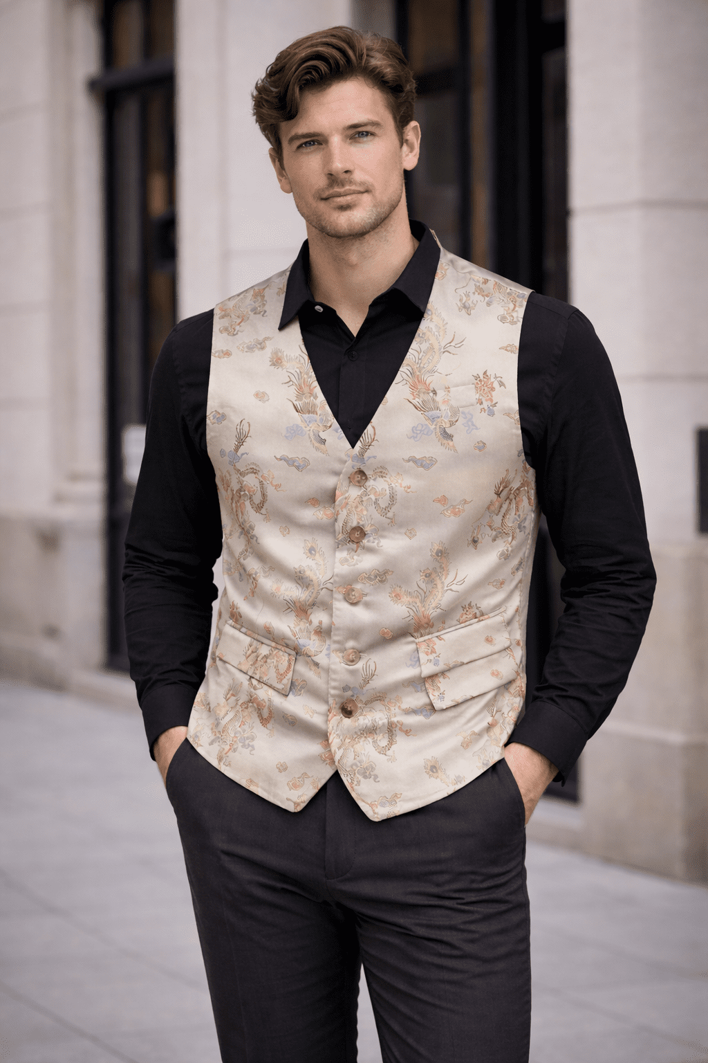 A refined men’s waistcoat crafted from Premium Satin with elegant Jacquard detailing and real horn button fastening. Designed to elevate formal outfits with depth, shine, and distinctive character. Offered in Pink Jacquard, Glossy Ethnic Jacquard Satin, and Black & Red Jacquard.