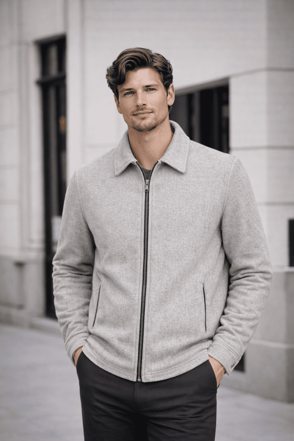 The Nova Zip Shacket from Jeffery Green is expertly crafted in Jeffery Green’s own factory in the heart of London, England — proudly Made in the UK. Tailored from 100% British wool, this elevated shacket blends the comfort of outerwear with the clean lines of tailored menswear, delivering a modern, luxury layering piece in a classic grey tone.