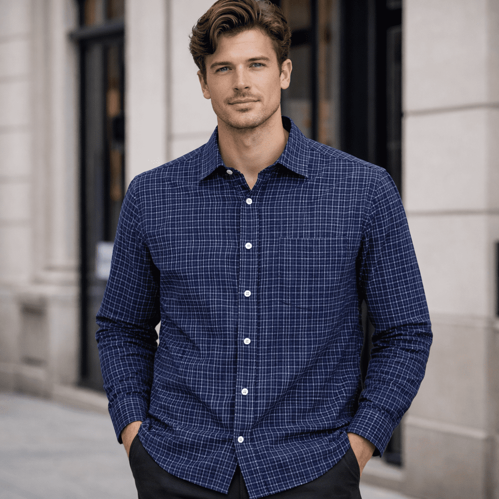 A refined men’s check shirt crafted from 100% yarn-dyed cotton for softness, breathability, and everyday comfort. Designed in a classic regular fit and finished with real horn buttons for a refined heritage touch. A versatile piece that transitions easily from casual wear to smart styling.